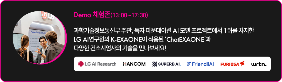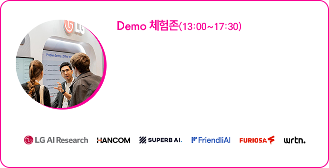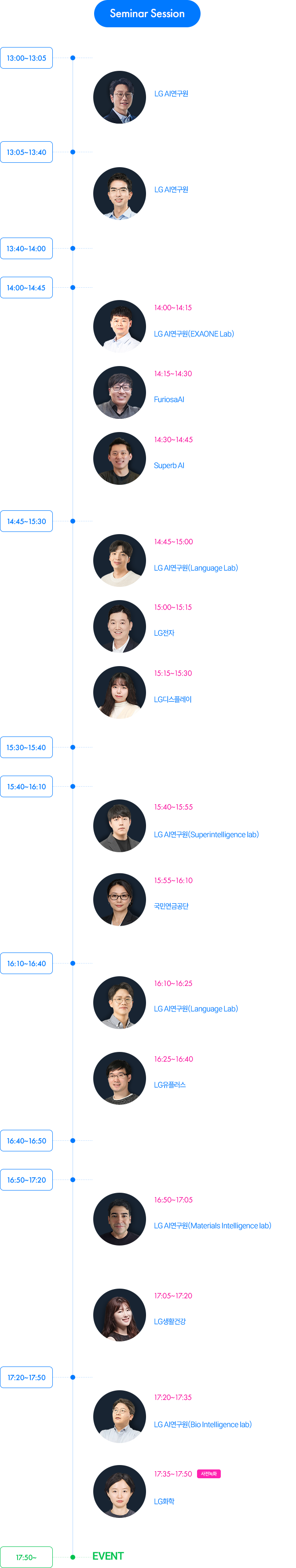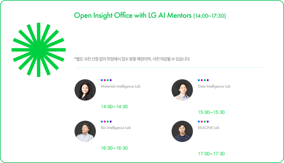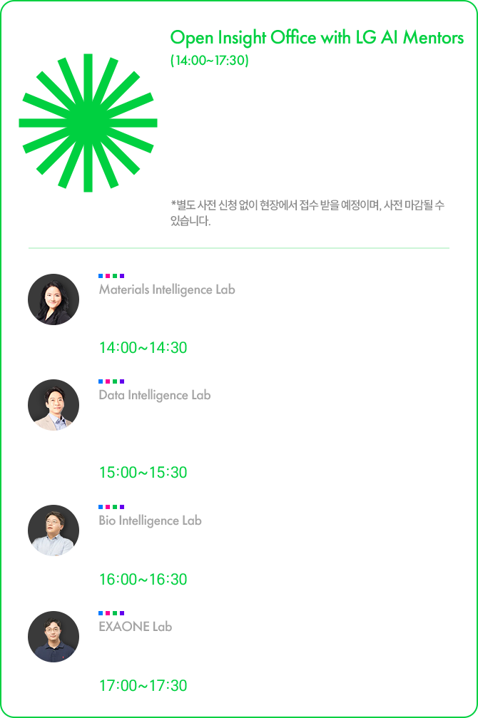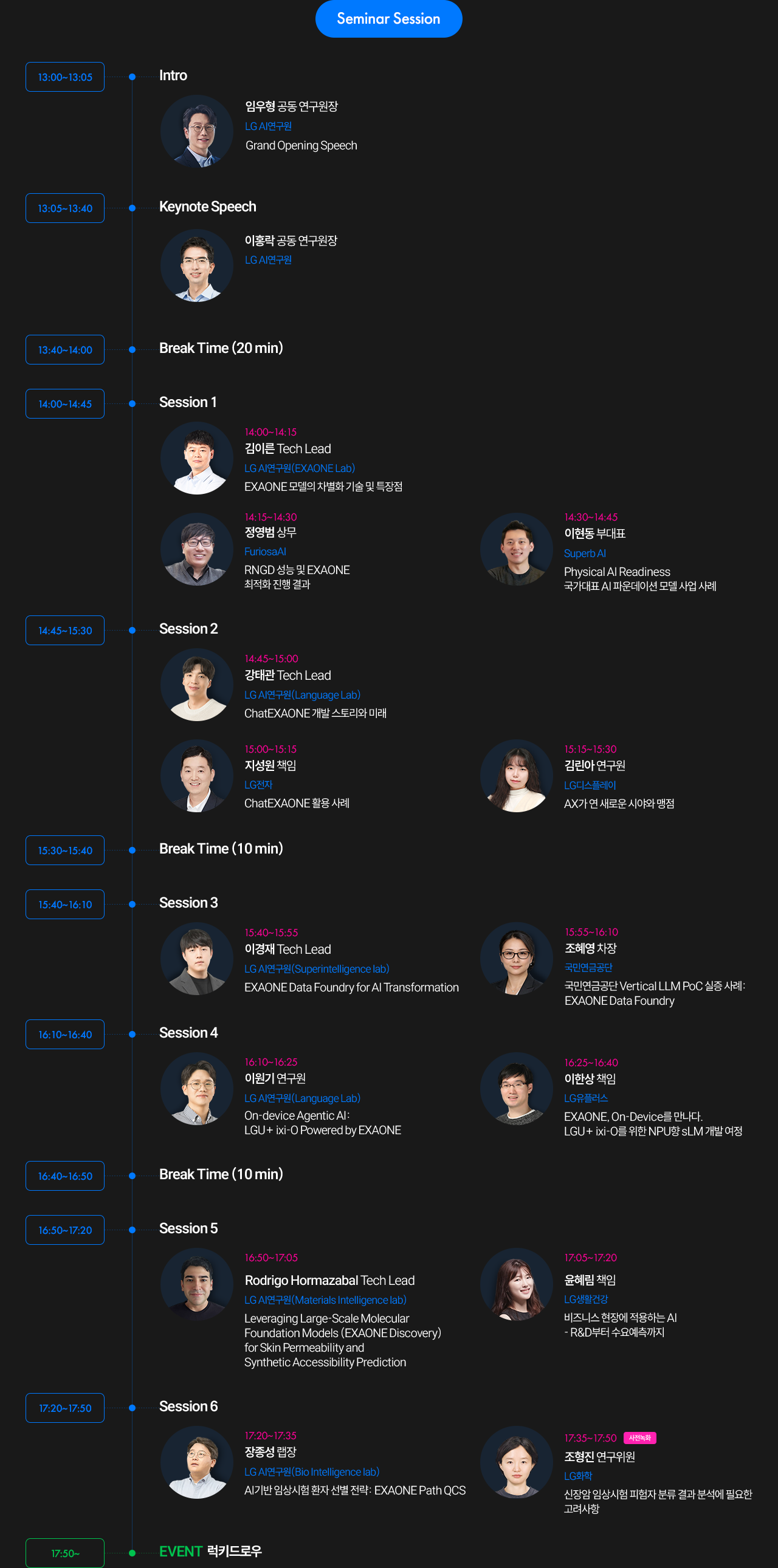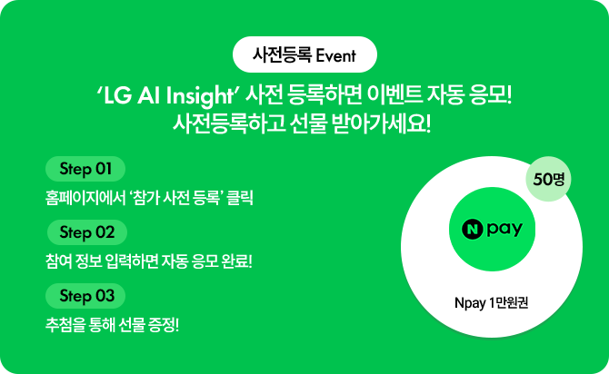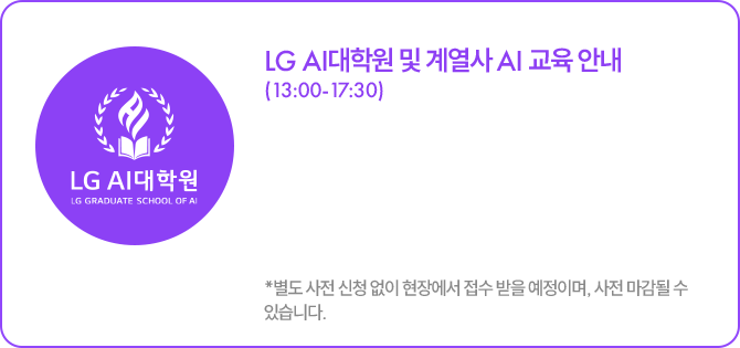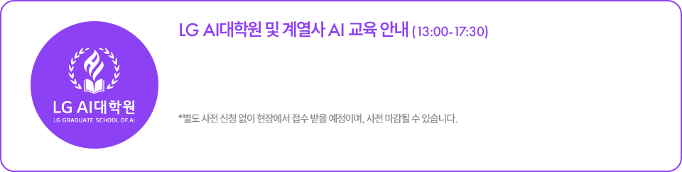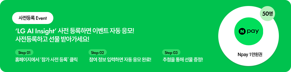 From AI Research - To Real-World Impact LG AI INSIGHT 2026 Date 2026. 3. 19. Thu. Location LG Sciencepark ISC 5F From AI Research, To Real-World Impact LG AI연구원이 LG AI Insight 2026에 여러분을 초대합니다. 이번 행사는 LG AI연구원의 AI기술이 연구를 넘어 실제 업무와 현장에 어떻게 적용되고 있는지 공유하는 자리입니다. 다양한 산업과 계열사 사례를 통해 AI가 일하는 방식을 어떻게 바꾸고 있는지, 그리고 우리의 업무에 어떤 실질적인 변화와 임팩트를 만들어내고 있는지 쉽고 생생하게 소개합니다. AI연구가 여러분의 업무에 닿는 순간, LG AI Insight 2026에서 함께 확인해 보시기 바랍니다. 온라인 등록이 마감되었습니다. 이후 참가를 희망하시는 분은 현장방문을 통해 등록해 주시기바랍니다.